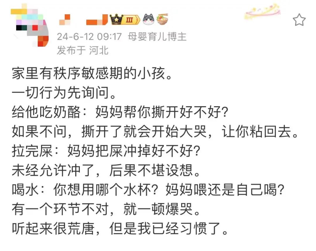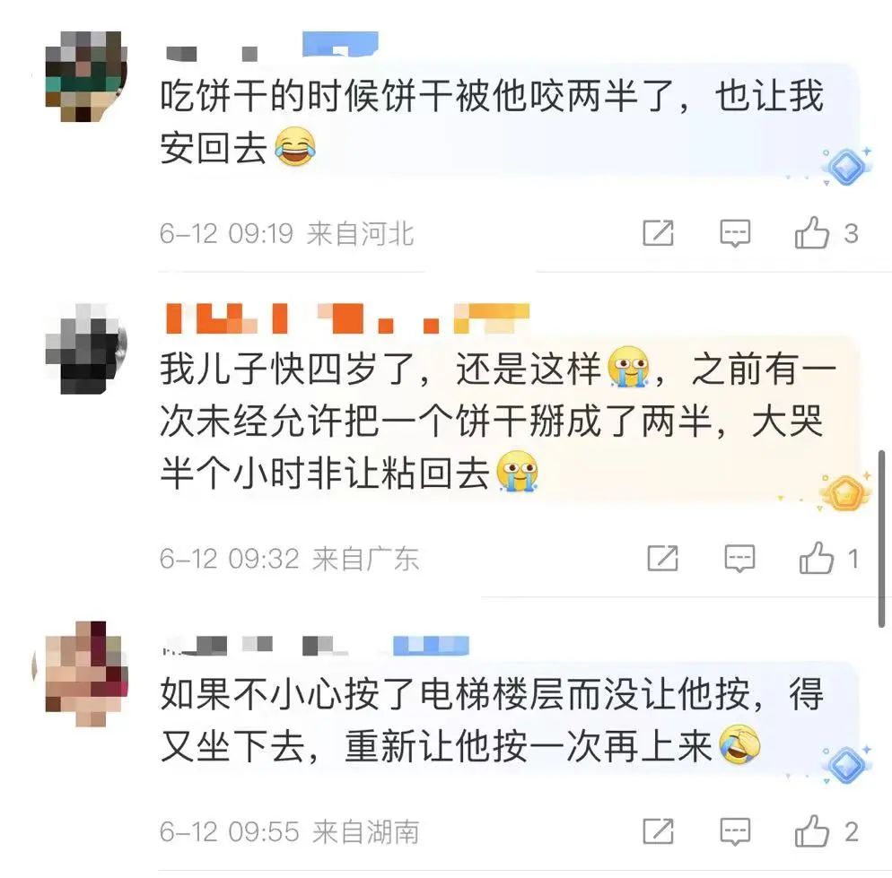 微博上的一个母婴博主,感慨自己的宝宝正处于「秩序敏感期」。虽然行为很“荒唐”,但是自己已经开始适应。这条微博一发出,好多同龄宝妈都纷纷倒自家苦水,各种离大谱的行为,让你根本想象不到,究竟是哪里“点燃”了娃的哭点。