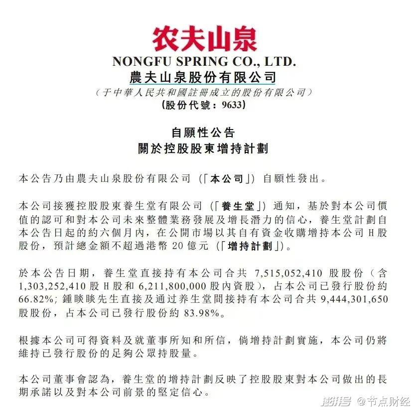 7月9日盘后,农夫山泉发表公告,宣布公司控股股东养生堂计划自7月9日起的约6个月内,在公开市场以其自有资金收购增持公司H股股份,预计总金额不超过20亿港元。