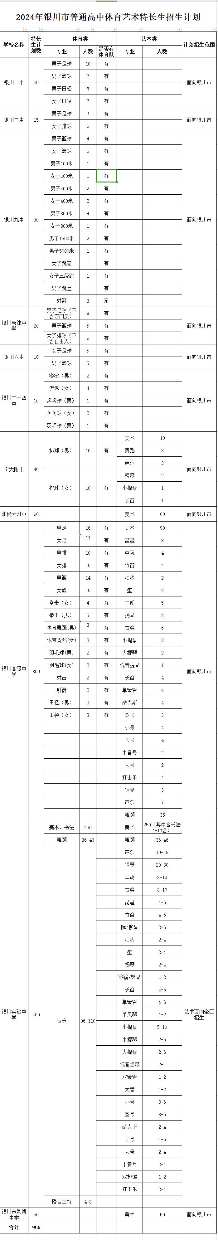 2024年银川市三区普通高中艺术体育特长生招生工作方案出炉