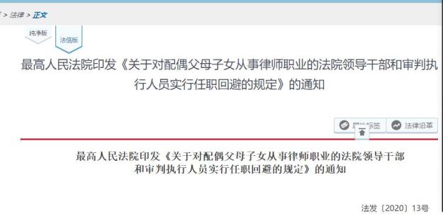 4月17日,最高人民法院发布《关于对配偶子女从事律师职业的法院领导干部和审判执行人员实行任职回避的规定》。旨在防止法官私人利益和公共利益发生直接冲突,从而维护公正廉洁司法。该规定于5月6日起正式实施。