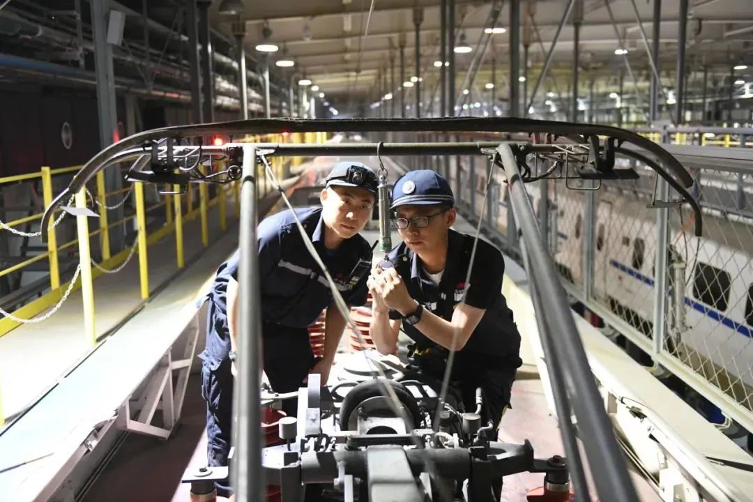 包头车辆段动车组机械师检查动车组车顶受电弓状态。金峰 摄