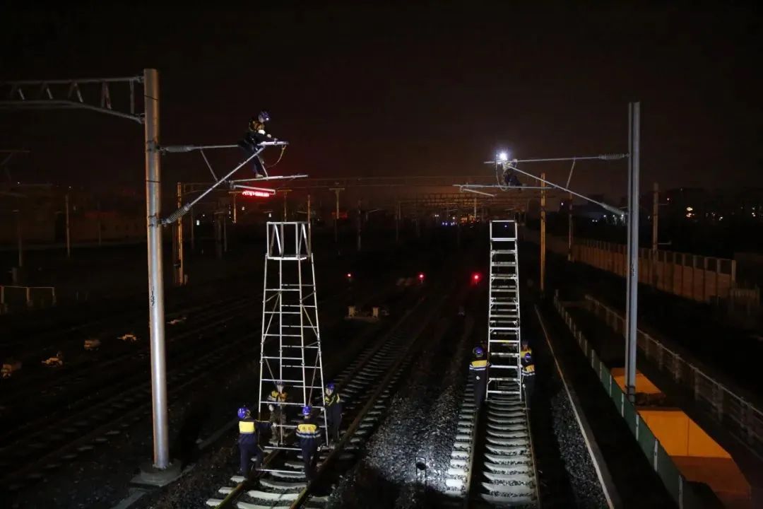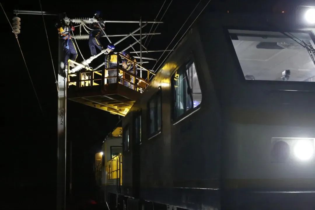 呼和浩特供电段充分运用垂直“天窗”优势,组织两台梯车同时对京包高铁呼和浩特东至旗下营南接触网设备进行检修。刘锦波 摄在夜晚的铁道线上