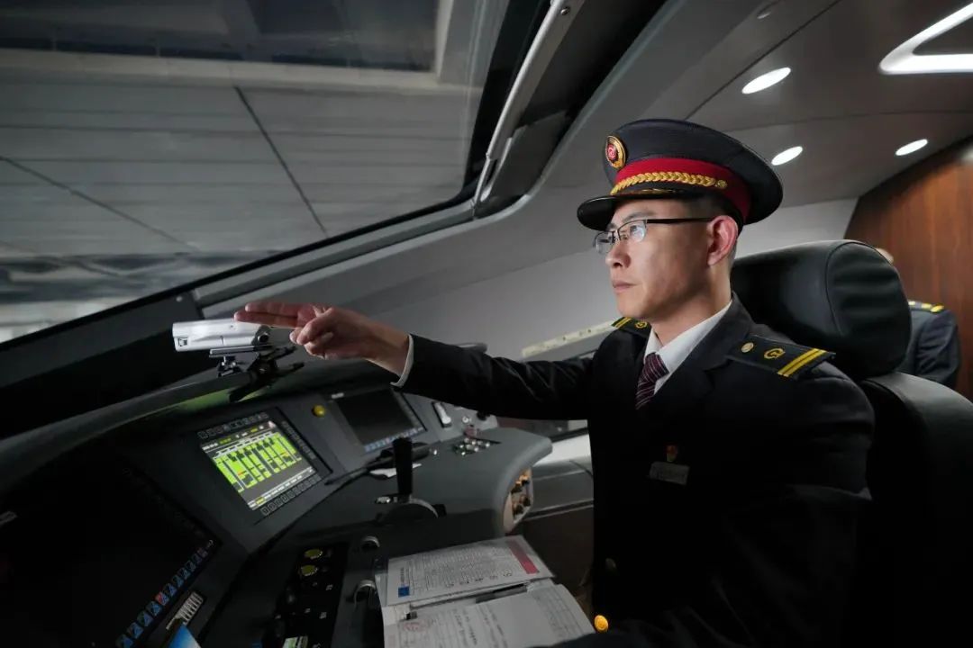 火车司机全神贯注地驾驶着列车