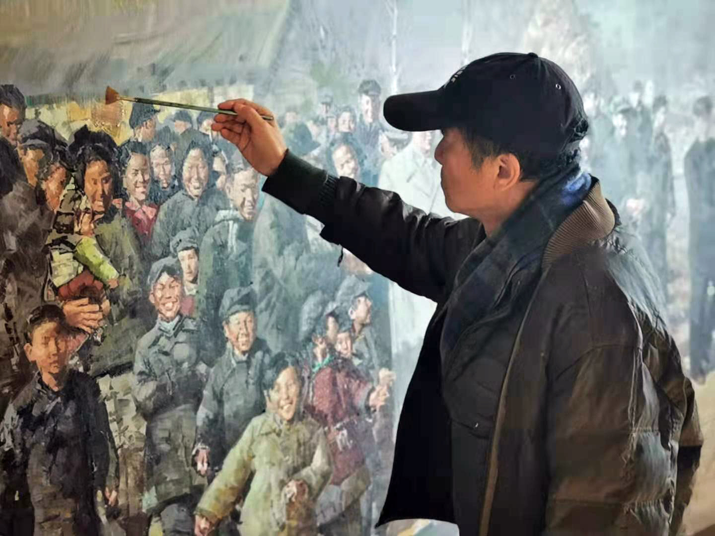 江南时报:历史并不仅仅是文字文献,图画也能体现历史真谛,承载文字等媒介无法记载的历史内容。在这幅《1956·南京·毛主席来到十月村》中是如何体现真实性的?