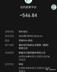 男子7月9日23点46分的付款截图显示,商品名“芳香spa+热灸”,商户名为重庆往约到家企业管理(集团)有限公司,付款546.84元,图上还有订单编号。