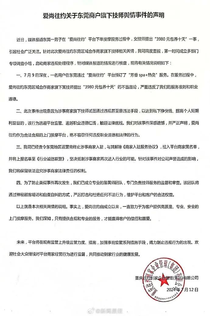 7月12日,爱尚往约到家平台官微发布关于东莞商户旗下技师舆情事件的声明:近日,媒体报道东莞一男子在“爱尚往约”平台下单按摩服务过程中,女技师提出“3980 元包养十天”一事引起社会广泛关注,针对此次爱尚往约东莞区域合作商家旗下技师相关舆情,我司高度重视,第一时间成立多部门专项调查小组,针对媒体报道的况进行核查,启动商家违规处理程序,已责令终止涉事商家入驻,与其解除协议,拉入平台黑名单。