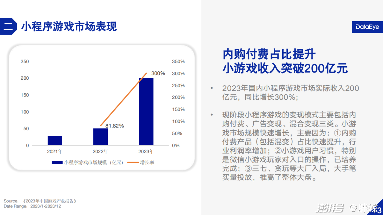 破开这一局面的是小游戏。《2023年中国游戏产业报告》数据显示,2023年国内小程序游戏市场实际收入为200亿元,同比增长300%。活跃用户同样惊人,根据 2023 年 6 月微信小游戏开发者大会公开的数据,2023年上半年微信小游戏用户总量已突破10亿,月活用户达到4亿。