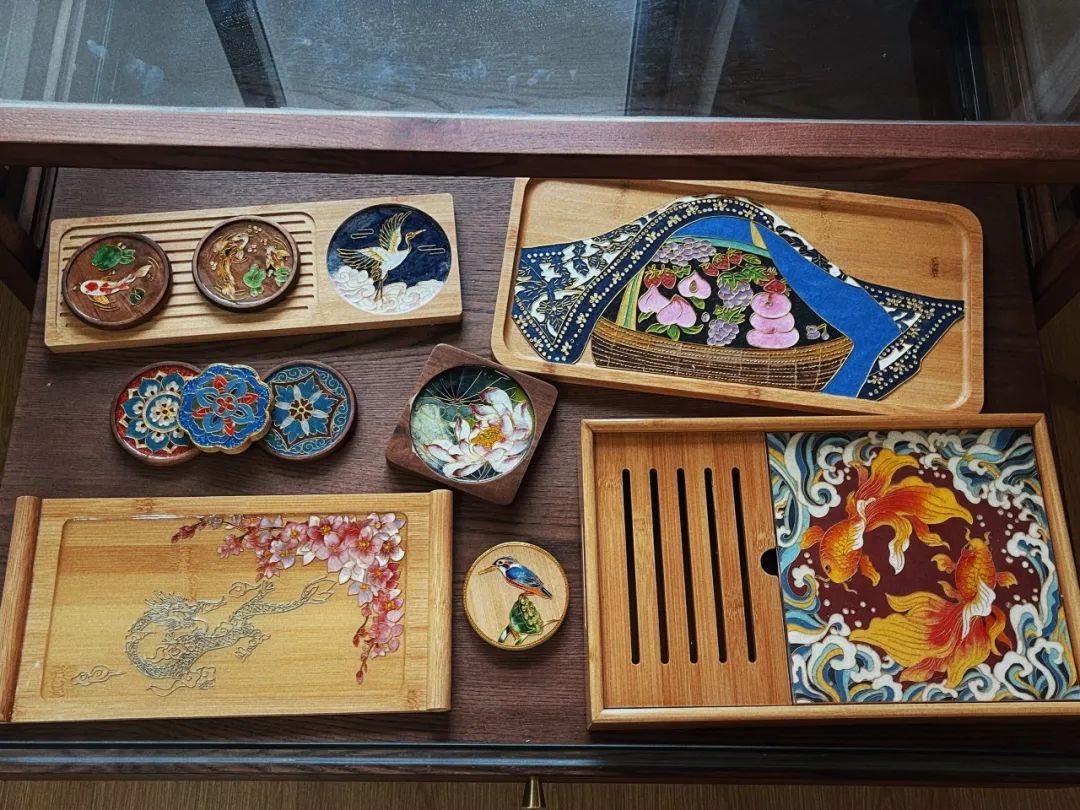 与掐丝珐琅依托铜、金等材质作为胎体的传统工艺不同,龚恬苇将传统制作工艺融入了更加丰富多样的创作载体。杯垫、项链、钥匙扣……这些日常可见的实用物品在龚恬苇和她的学生手中,都可以成为掐丝珐琅创作的“平台”,结合颜彩画、国画等绘画手法,让掐丝珐琅这一传统“非遗”项目焕发出新的活力。“龚老师会鼓励我们要多上手制作,不要怕做错做坏。”王一凡是上海食品科技学校2103班的学生。去年在龚恬苇指导下,他与其他几位同学制作的作品入围了全国职业院校作品非遗展示,也让这些之前从来没有接触过掐丝珐琅的少年们心中埋下了“非遗”的种子。