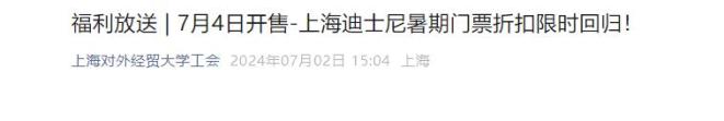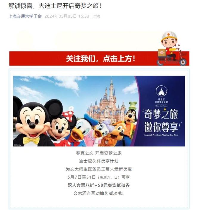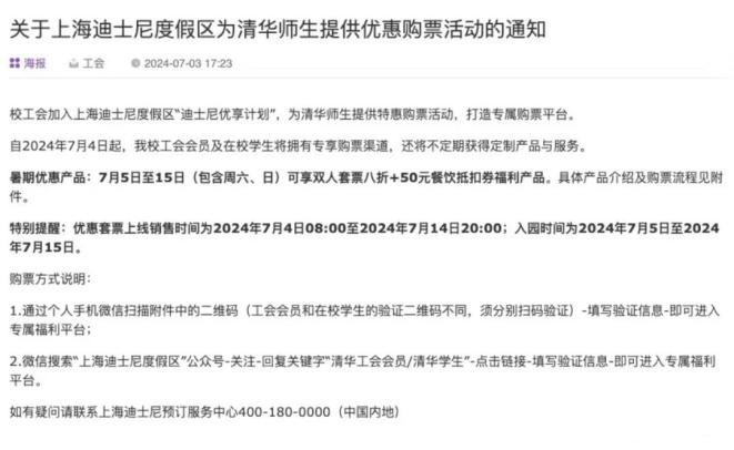 记者查询清华大学官方平台显示,校工会加入上海迪士尼度假区“迪士尼优享计划”,为清华师生提供特惠购票活动,7月5日至15日(含周六日)可享双人套票八折+50元餐饮抵扣券。