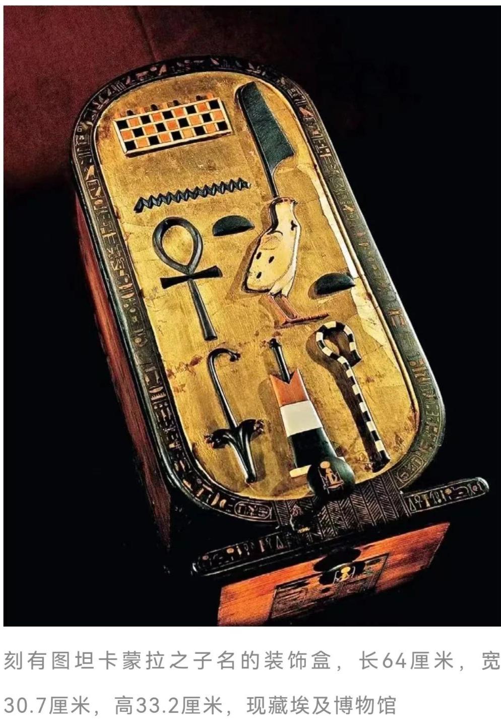 “图坦卡吞”:法老的少年时代图坦卡蒙(Tutankhamun),即“阿蒙活着的形象”原本是“阿吞活着的形象”,也就是图坦卡吞(Tutankhaten),暗示着王子少年是在新都埃赫塔吞度过。结合“阿玛尔纳文书”等其他文物佐证,后人得知图坦卡吞出生在埃赫那吞即位后第9年,图坦卡吞王子接受过完善的教育。在图坦卡蒙的墓中,人们找到大批文具,包括莎草纸、17个书写板、1个笔盒、2支笔,以及磨平莎草纸、砂岩橡皮擦和五种颜色的墨水,其中一个镀金书写板(No.271e)显然是他童年学习所用,上面标注的名字还是图坦卡吞。此外,人们还在他的陪葬品中找到6辆被拆解的战车和包括弓、箭、刀、弹弓、标枪、棍棒和皮甲组成的完整武器库,特别值得注意的是复合弓箭惊人的数量。在他之前,考古学家在整个埃及只找到12把复合弓,但在图坦卡蒙墓里,人们一口气就找到32把。其中一张被卡特称为“荣耀之弓”,该弓通体镀金,刻有各种动物图案和图坦卡蒙王位名铭文,“精细得不可思议,堪称珠宝工艺中的杰作”,此外还有400支弓箭。