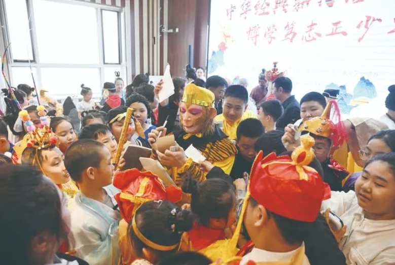 被网友亲切称为“雪饼猴”王铁柱的演员王庆峰与学生们亲切互动。