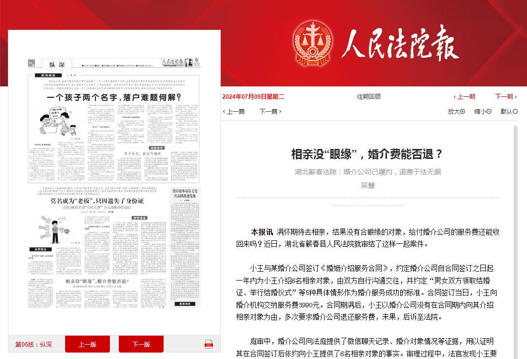 蕲法天平向上滑动看下一个原标题:《【媒体聚焦】《人民法院报》:相亲没“眼缘”,婚介费能否退?》