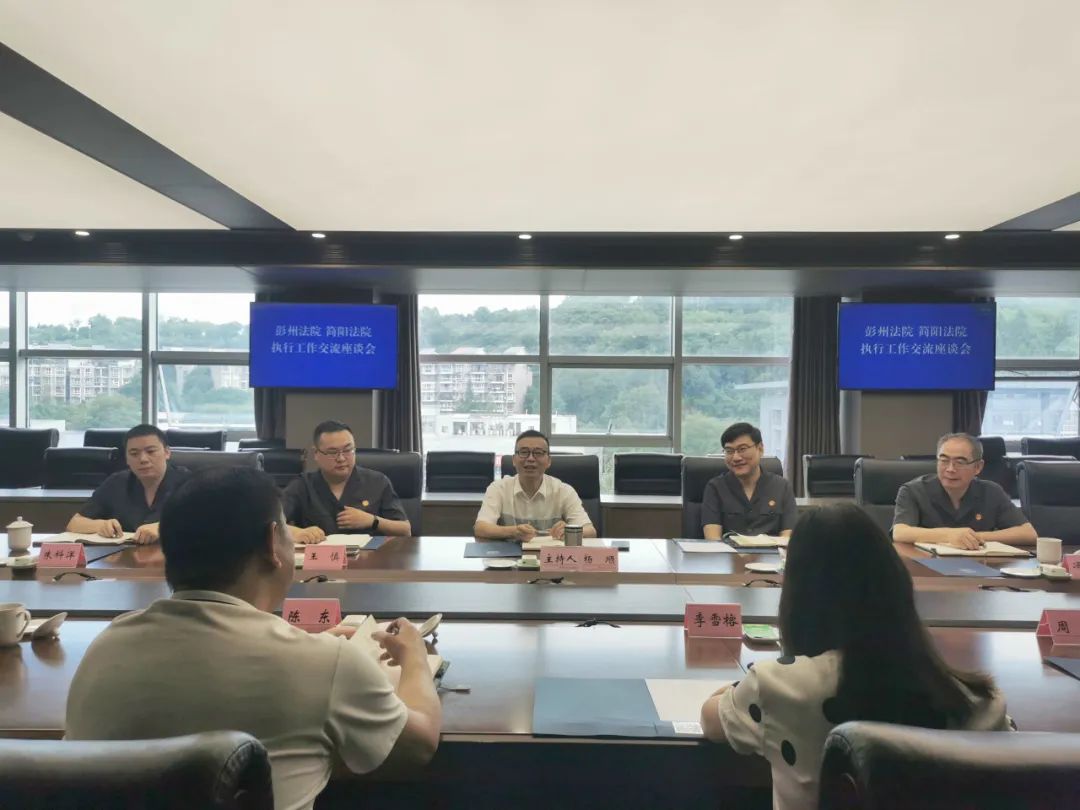 7月11日,彭州法院党组副书记、副院长李雪榕一行到简阳法院学习交流执行工作,双方就执行团队构建、队伍管理、终本出清专项活动推进等开展了深入交流座谈,共促执行质效提升。