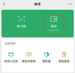 在微信底部菜单栏,选择“我”——“服务”——“钱包”功能菜单。