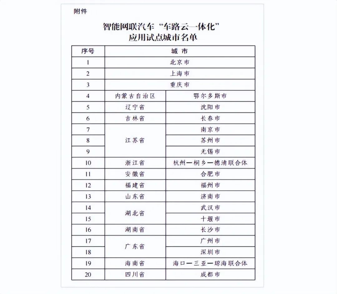 而在本月初,工信部等多部门联合发布了智能网联汽车“车路云一体化”应用试点城市名单,北京、上海、重庆等20座城市(联合体)入选。
