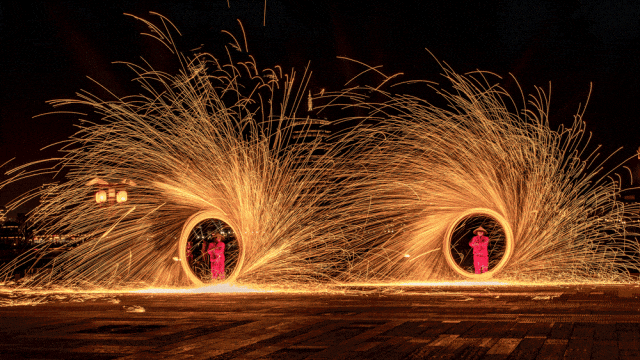 非遗打铁花、风火轮表演震撼来袭1600℃的铁水经花棒击打