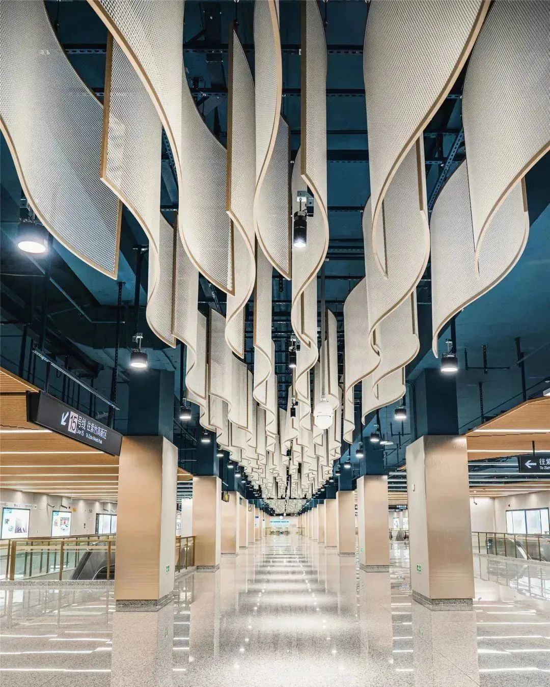 长风公园地铁站的设计中融入了山水的元素,蓝白色调的波浪吊顶像是蜿蜒流动的河水,很有动感,也为长风公园地铁站带来一丝清爽。