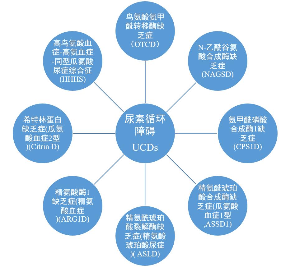尿素循环障碍(Urea Cycle Disorders, UCDs)因为参与尿素循环的酶和转运蛋白缺陷,影响氨基酸分解代谢产生的氨不能通过尿素循环形成尿素排出体外,导致血氨升高为特征的一组遗传代谢病[1],其致残、致死率较高。
