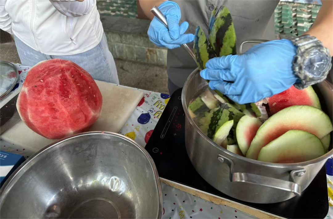 此外,保育员依据时令特点,采用荷叶、玉米叶、苹果块精心制作成季节限定丰容,营造满满夏日氛围。在品尝了一会竹子之后,淘气的“星一”一掌打翻了保育员准备的冬瓜盅,紧接着凑上前去翻找里面的“宝贝”,萌萌的样子让围观的小朋友们忍俊不禁。