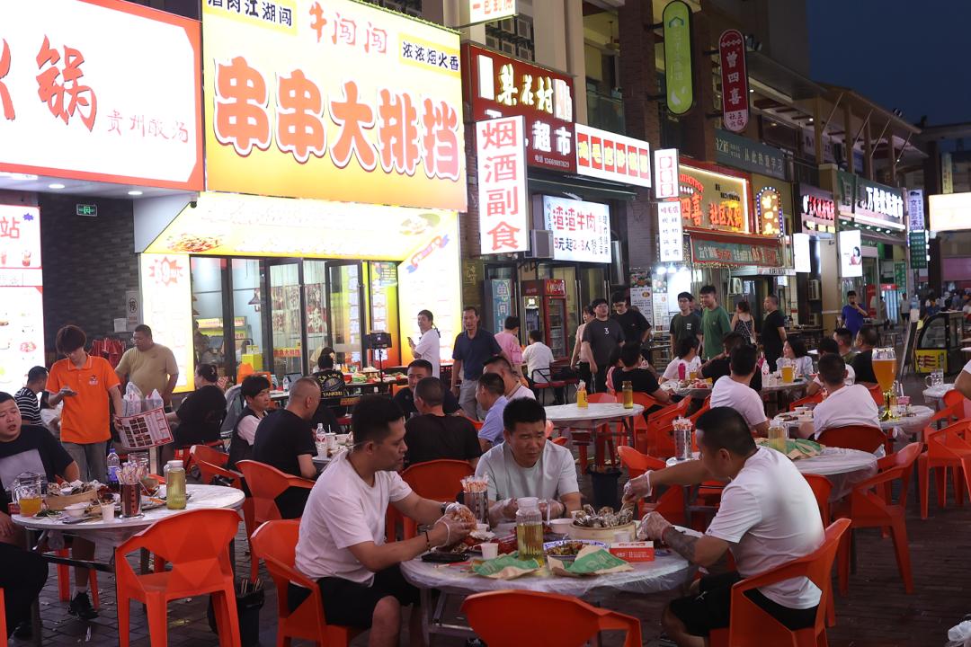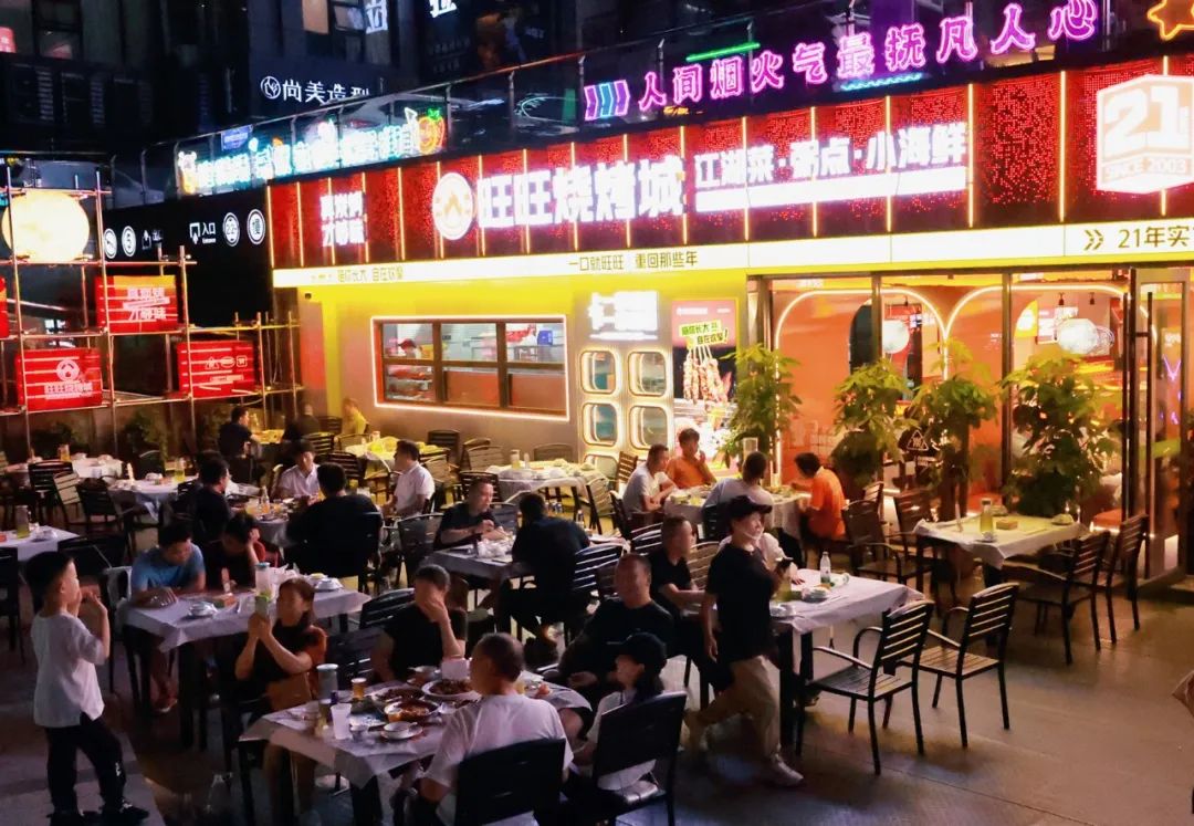 旺旺烧烤城在旺旺烧烤城,一串串肉串在火焰的反复炙烤下发出焦香,随后一把把辣椒粉、孜然粉撒下,香气渗透油脂,在夜空中飘扬。
