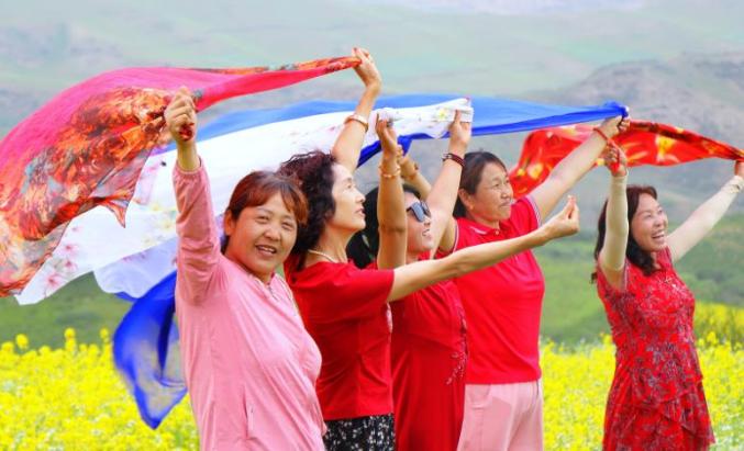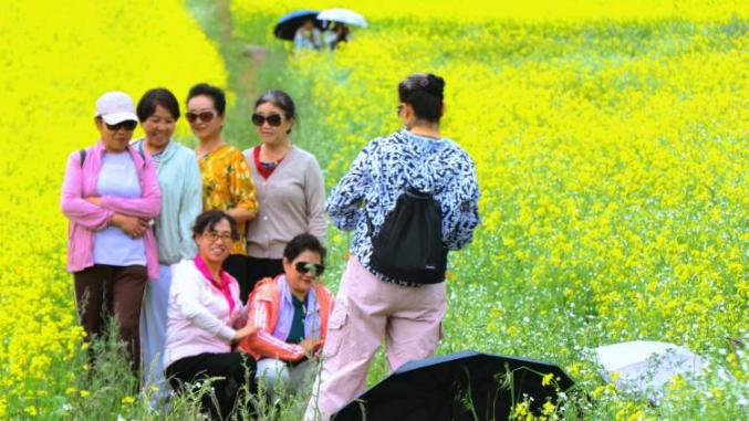 一场细雨过后,微风吹拂,金黄色的花朵随风摇曳。游客们置身花海,赏花、拍照,尽情享受大自然馈赠的田园诗意。来自兰州的游客张晶悦说:“这里油菜花开得特别好看,种植面积也大,很适合拍照打卡,下次要带更多朋友们来玩。”