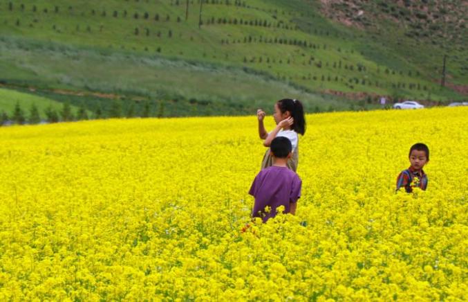 小朋友在油菜花海中赏花游玩。来源:武威日报