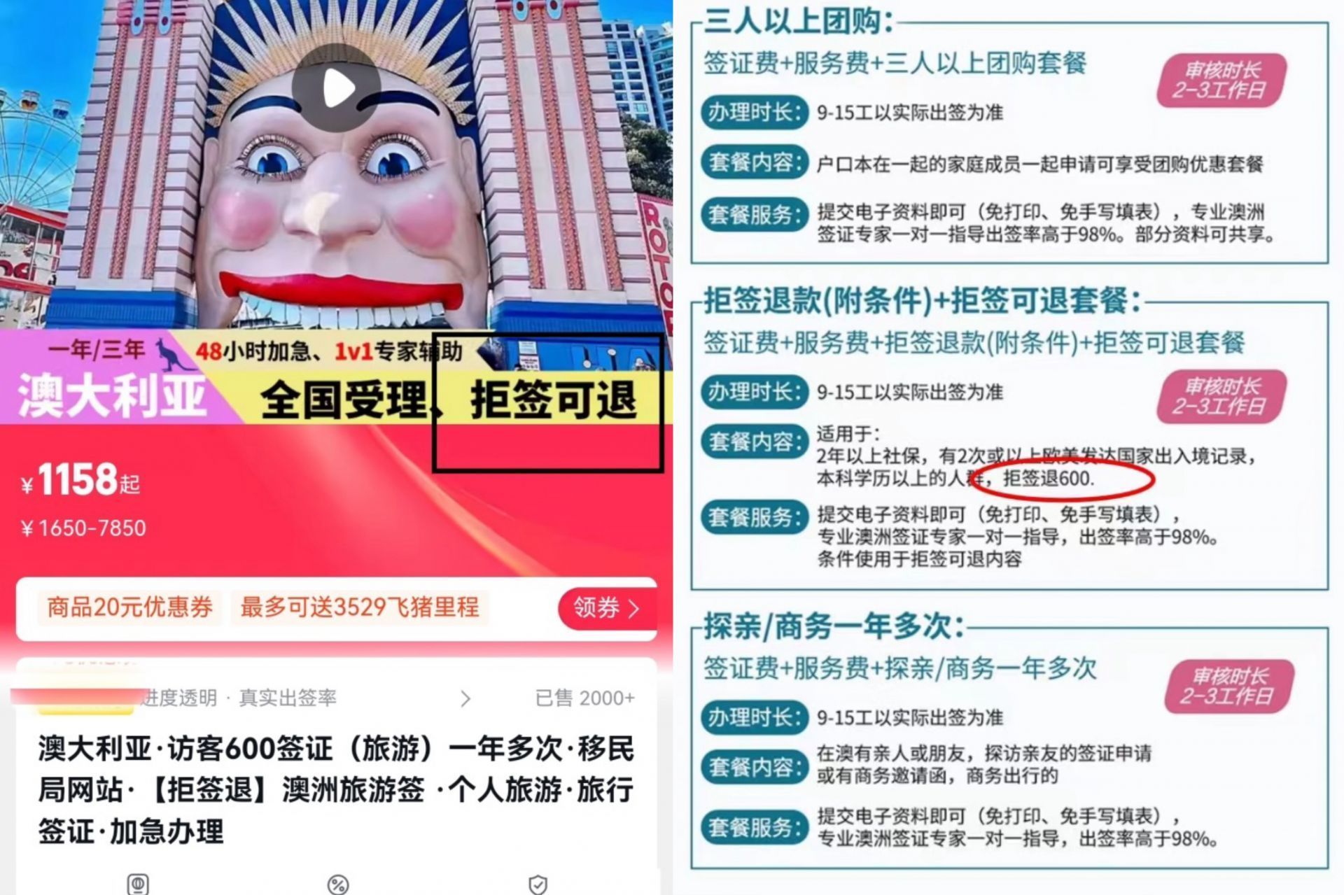 某平台售卖的签证产品,页面标注拒签可退,下拉后细则写着只能退600元。