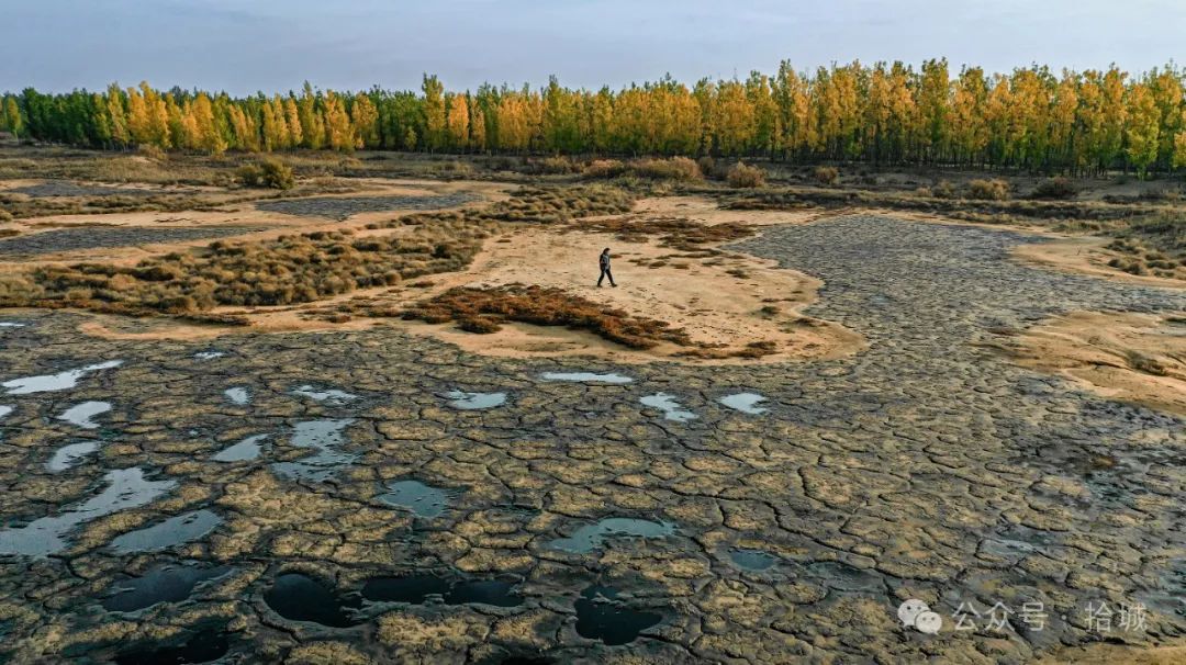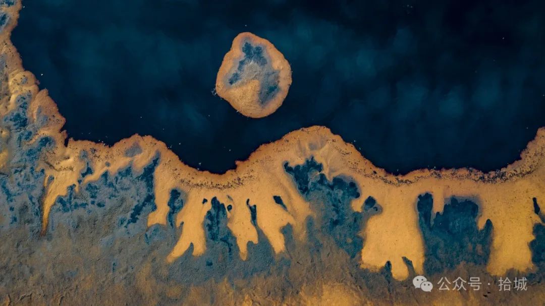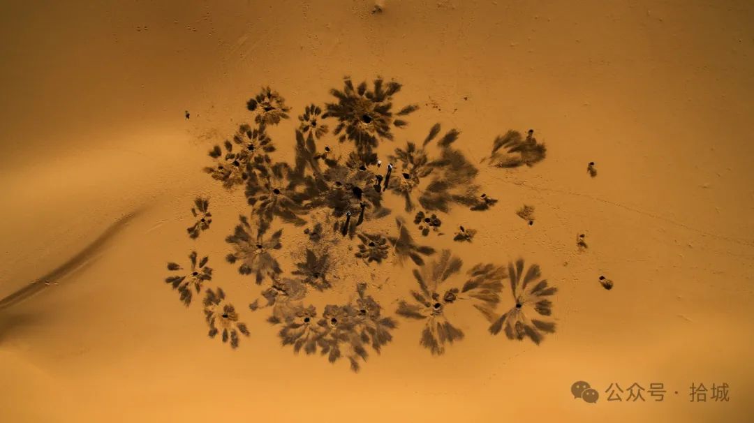 2019年10月,宁夏回族自治区中卫市腾格里沙漠边缘,150米高空俯瞰造纸黑液污染的沙漠局部。