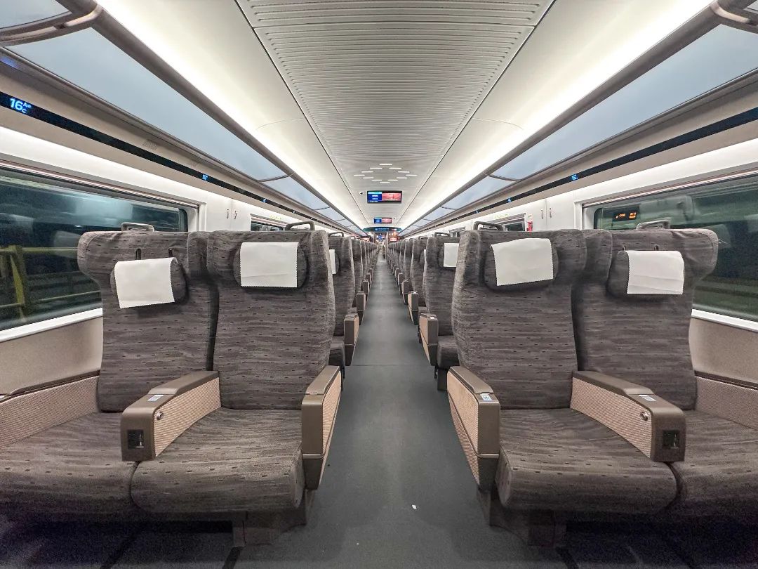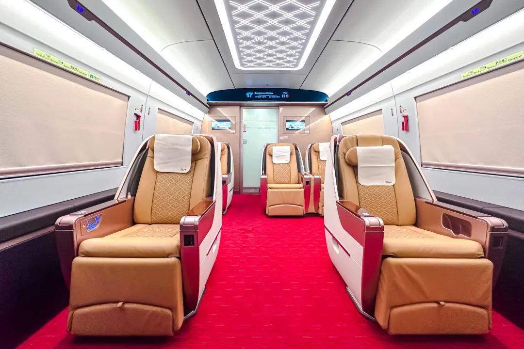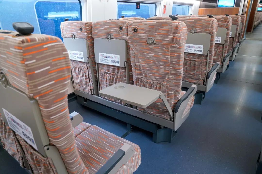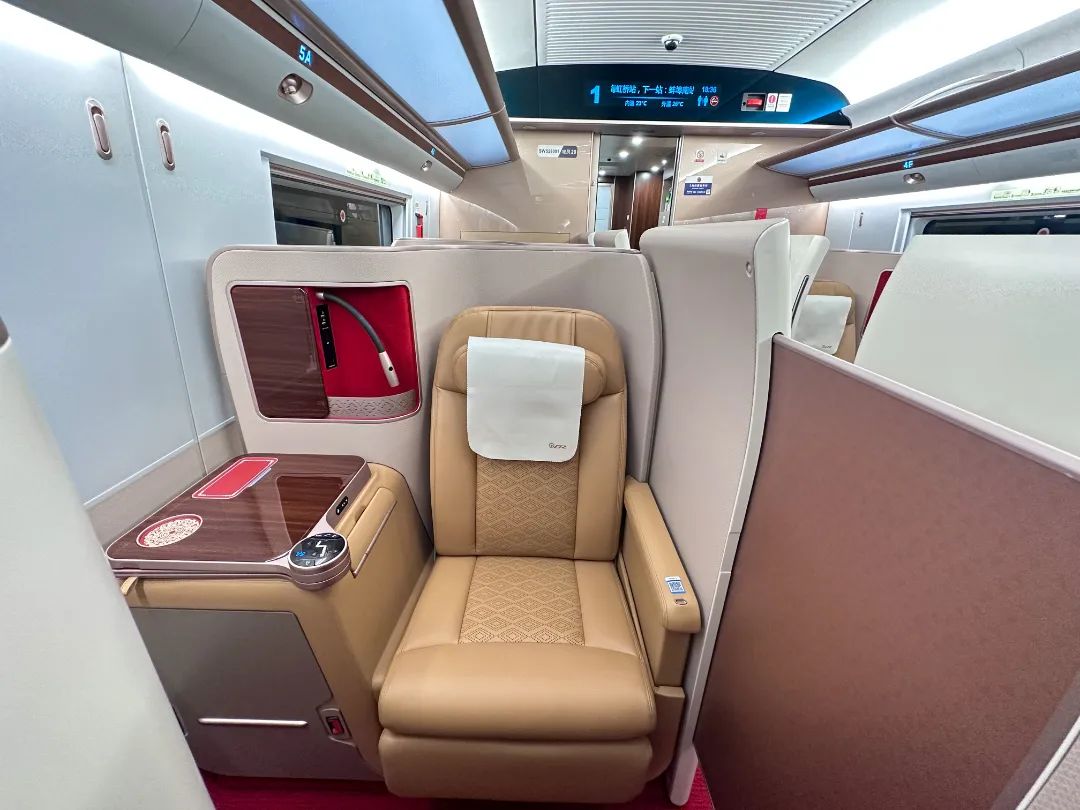 一等座增设优选一等座席,使用“贝壳式”电动座椅。前后排座椅间距进一步拉大,座椅可180度旋转,靠背和腿部角度可独立调节。