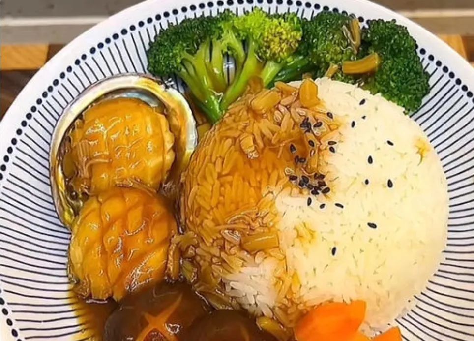【鲍汁捞饭】材料:鲍鱼,鲍汁,米饭,西兰花。