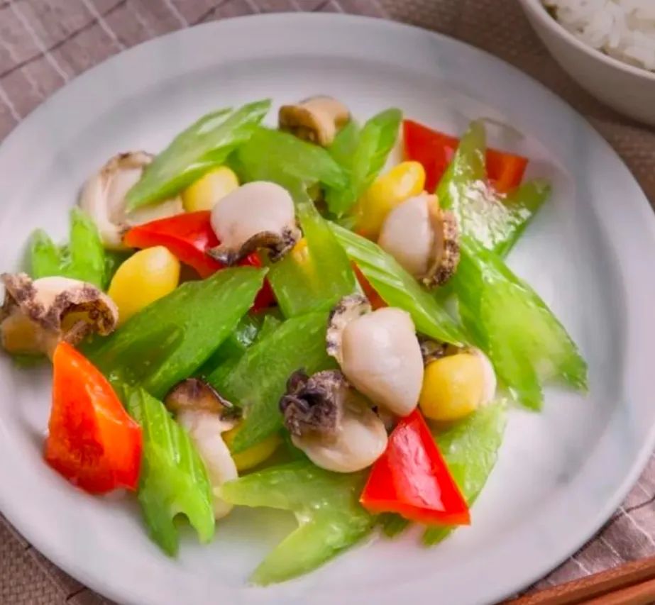 4.热锅,加油,下西芹,大火炒至比较清脆,放点盐,待西芹差不多熟了就倒入刚才炒好的鲍鱼片,大火炒一会儿,根据个人喜好可以勾芡下,然后就可以出锅了。