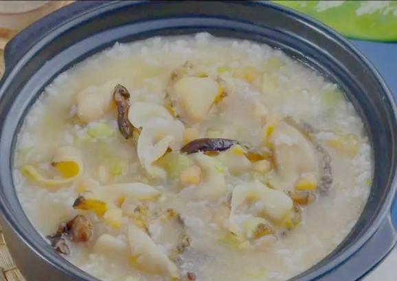 【鲍鱼粥】材料:鲍鱼,姜片,葱,鸡肉,金针菇,香菇,芹菜,米,盐,白胡椒粉,香油。