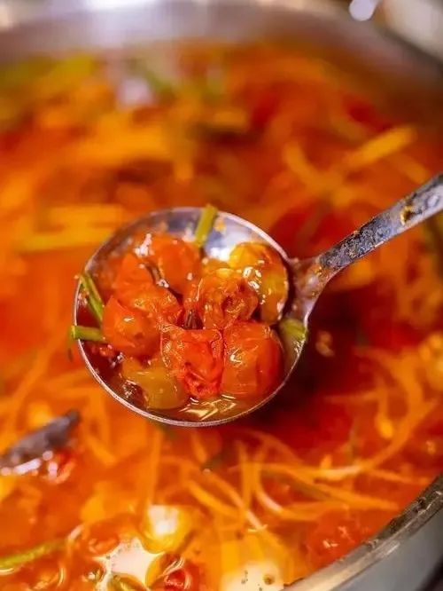 红酸汤以鲜红辣椒、毛辣角(当地野生番茄)为主要原料,经破碎后加入生姜、白酒、甜酒等辅助原料,装坛发酵而成,以其独特的色(鲜红)、香(清香)、味(醇酸、回甜)而著称。