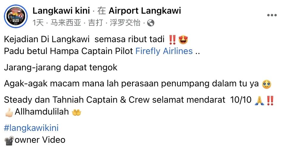视频配文写道:“今天在浮罗交怡发生的事件,这是一架飞机在强风期间的表现。飞行员真是太厉害了。我们很少能看到这种情况。想象一下机上乘客的感受。祝贺这次满分的完美降落。”