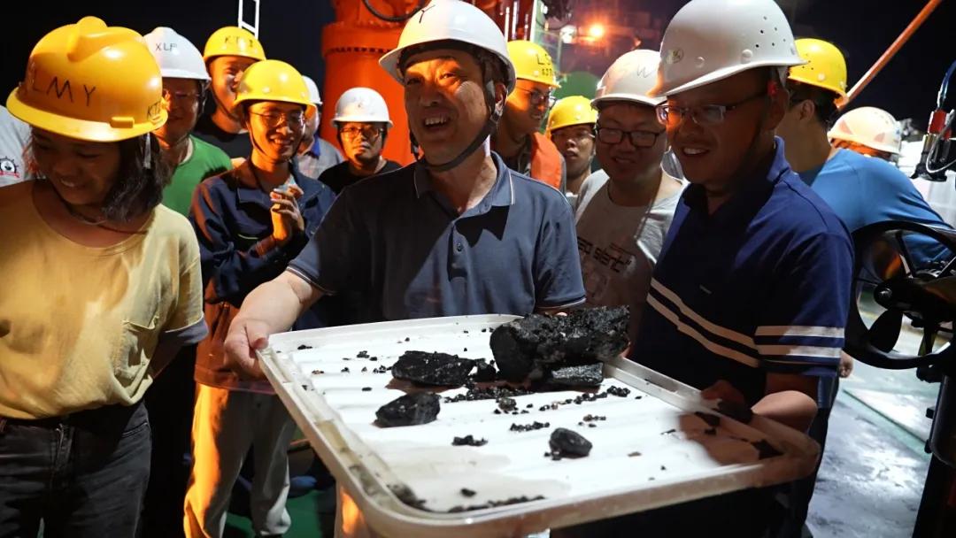此外,“开拓二号”还展现出了强大的海底矿岩钻进与采集能力,对紧密附着在坚硬矿岩上的多金属结壳、浅埋于稀软深海沉积物中的多金属结核等不同类型海底矿物进行了高效开采收集,成功获得了200多公斤的多金属结壳、多金属结核、海底基岩等各类深海矿产样品。值得一提的是,赵国成作为团队的新兴力量,从十年前的一名上海交大船舶海洋与建筑工程学院研究生,“摇身一变”成了这次海试的青年骨干教师。“从实验室里几米水深的水槽测试到这次数千米水深的深海海底采矿作业,我获得了一段十分宝贵的学习和锻炼经历。这次海试成果让我们很振奋,我更加笃定深海采矿将会是我未来的研究方向。”他激动地说道。
