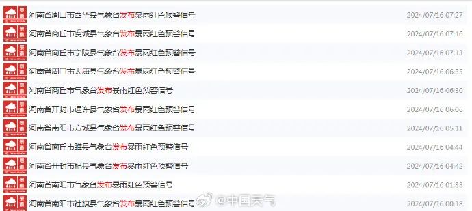 今天上午,淮河水利委员会升级发布洪水黄色预警,影响范围为河南信阳市、安徽阜阳市、六安市。河南省水文水资源测报中心7月15日20时发布水灾害风险提示,15日20时至16日20时局部强降雨影响洛阳市、南阳市、三门峡市、驻马店市、平顶山市、商丘市、周口市、许昌市、漯河市、开封市、新乡市、焦作市等地部分地区水灾害风险较高。