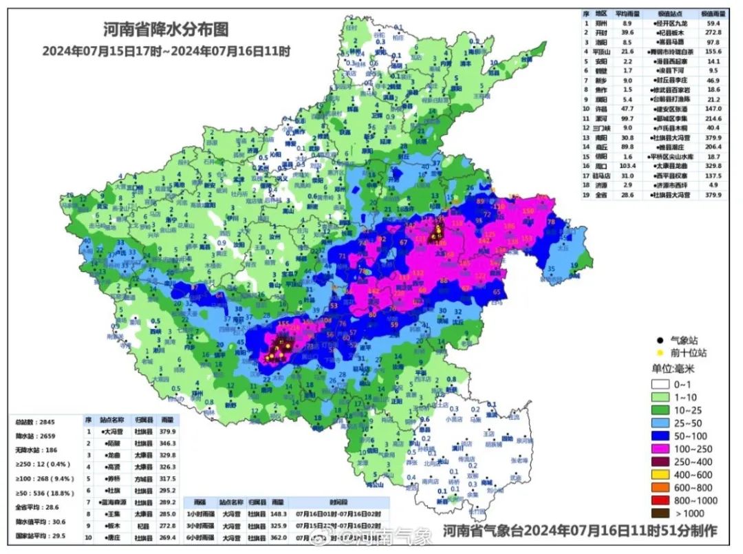 其中河南局地有特大暴雨