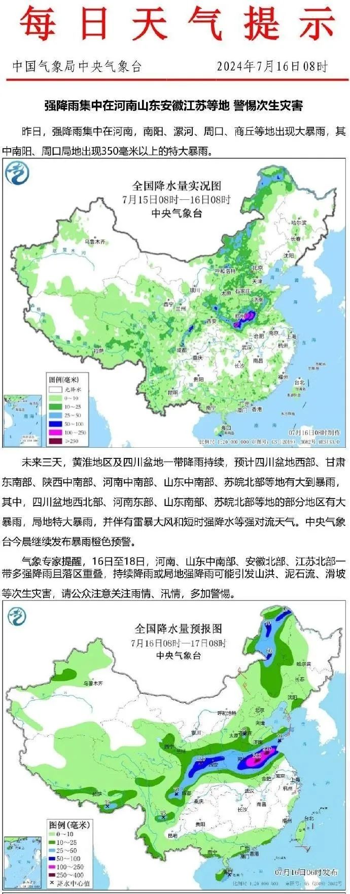 据@中央气象台预计:7月16日至18日,四川盆地西北部、河南东部、山东南部、苏皖北部等地的部分地区有大暴雨,局地特大暴雨,并伴有雷暴大风和短时强降水等强对流天气。经综合研判,中国气象局于今天9时将暴雨三级应急响应提升为暴雨二级应急响应。