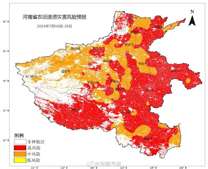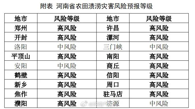 河南省气象局、河南省农业农村厅联合升级发布农田渍涝灾害高风险预警:7月以来我省大部地区降水较常年同期偏多1倍以上,部分农田土壤持续偏湿,天数已超过5天,豫南局部地区超过10天。预计未来10天我省降水持续时间长,累计雨量大、暴雨落区重叠度高,且有一定极端性,全省大部农田渍涝,灾害风险较高。