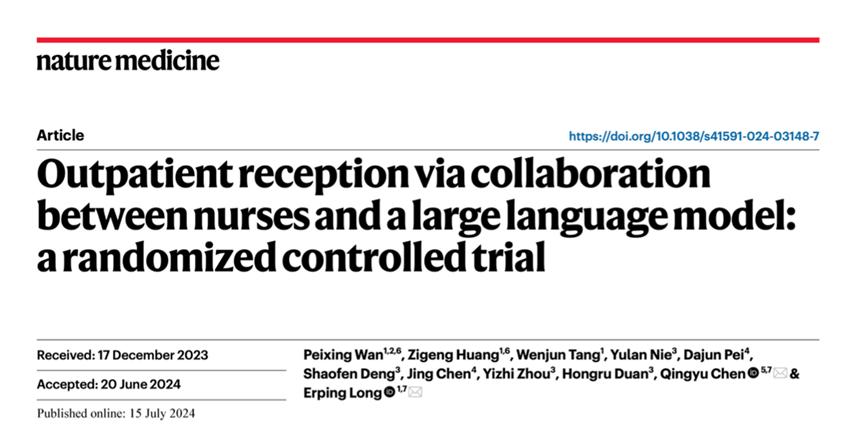 [1]Wan, P., Huang, Z., Tang, W. et al. Outpatient reception via collaboration between nurses and a large language model: a randomized controlled trial. Nat Med (2024). https://doi.org/10.1038/s41591-024-03148-7