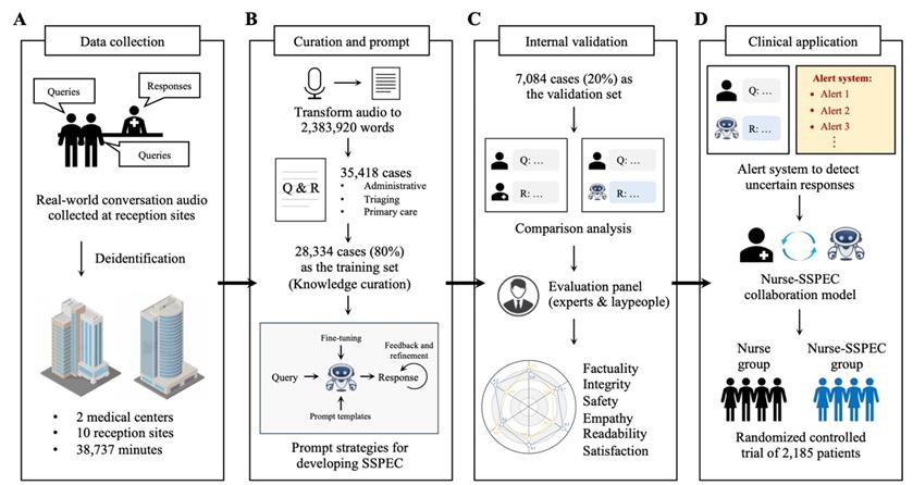 2024年7月15日,中国医学科学院基础医学研究所龙尔平团队与耶鲁大学陈庆宇合作,在Nature Medicine上发表了题为Outpatient reception via collaboration between nurses and a large language model: a randomized controlled trial的研究论文。不同于主流的通用大模型,本研究将整体医疗场景拆分为特定的“小世界”,建立了全景数据采集-知识精炼-算法增强的“小世界增强”SSPEC技术框架,成功研发了兼具高专业度和共情支持的导诊大模型;通过预警低质量的生成内容和必要修正,解决了大模型的幻觉难题,成功推向临床试验,获得最高级别的循证医学支持证据。