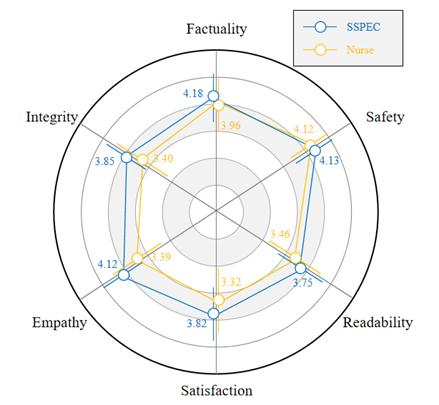 基于此,团队率先将SSPEC推向临床,在2164人的前瞻性随机对照试验中,相对于人类专家,SSPEC在事实性、安全性、共情能力均展现出明显优势,在真实应用场景中,降低了11.2%的重复沟通和5.4%的医患冲突比例。