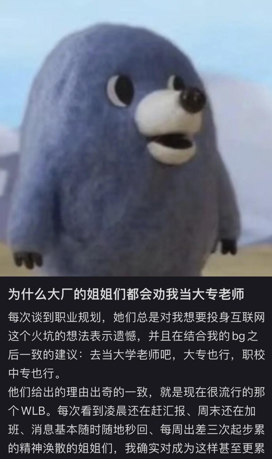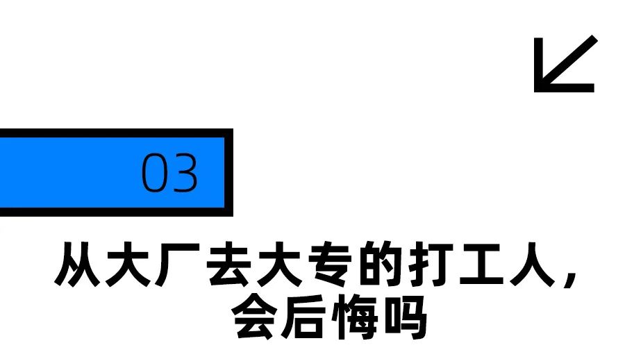 图源@余干小辣椒有人说,入职大厂和大专最大的区别是,“进入大厂,最初很风光,但每熬过一年,都会更担心自己过了35岁后的职场前景会不会一路下滑。但去大专,开头两年会比较艰难,因为一开始只能先从助理教做起,但随着你年纪越大,教学经验越丰富,便会越吃香。”