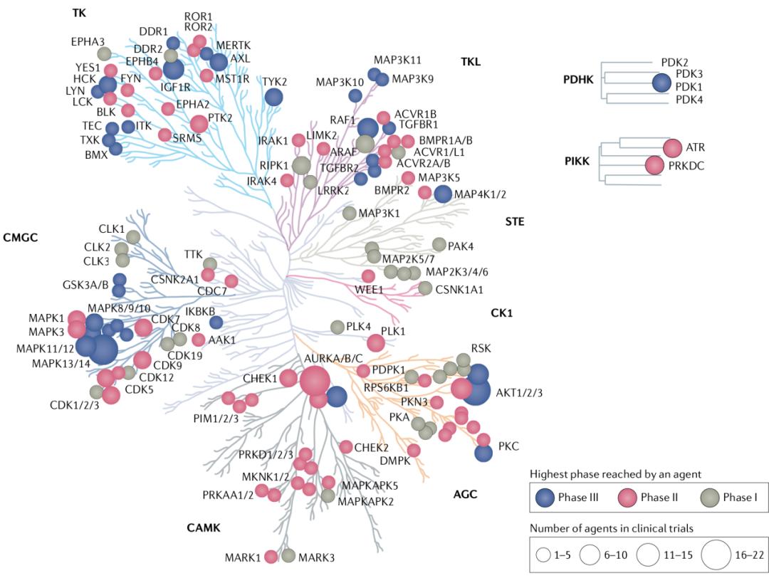 蛋白激酶(Protein Kinases)是催化蛋白质磷酸化的酶,参与调控细胞生长、分化、凋亡等关键细胞过程。在人体中已发现518种激酶(约50个家族),形成了错综交错的网络,在生命活动中起着广泛调节作用。颠覆传统认知,近年来研究发现激酶在基因表达、DNA修复、肿瘤微环境重塑中发挥关键作用。蛋白激酶发生突变、缺失导致其活性或表达水平异常,造成相应疾病发生,如炎症、肥胖、自身免疫性疾病、神经退行性疾病、心血管系统疾病等,其中癌症占比高。蛋白激酶已成为重要的药物靶点之一。