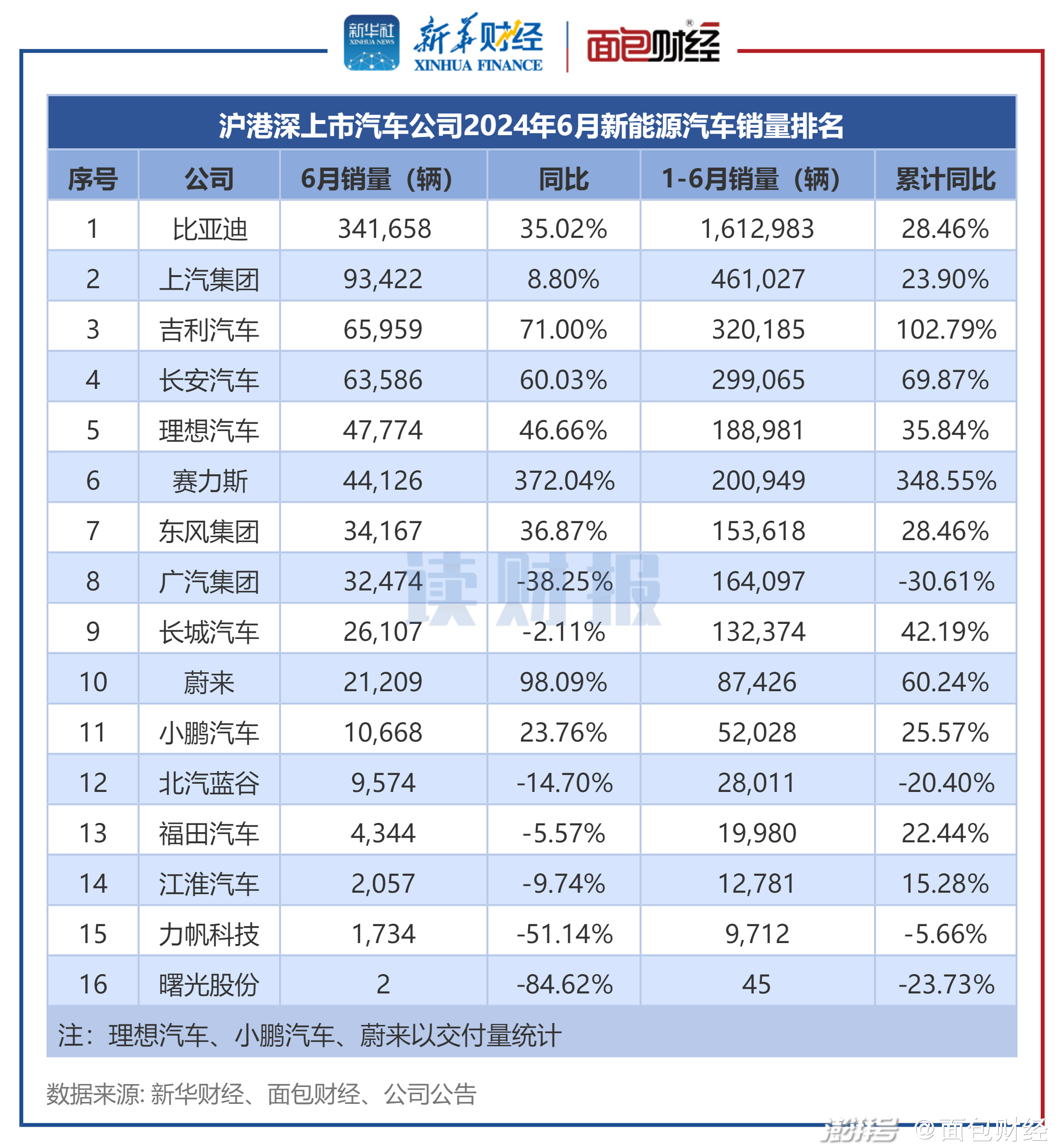 数据显示,比亚迪、上汽集团的6月新能源汽车销量均超过9万辆,其中比亚迪以34.17万辆位居行业第一。增速方面,赛力斯、蔚来、吉利汽车的同比增速超过70%;相比之下,曙光股份、力帆科技、广汽集团同比下滑超过30%。