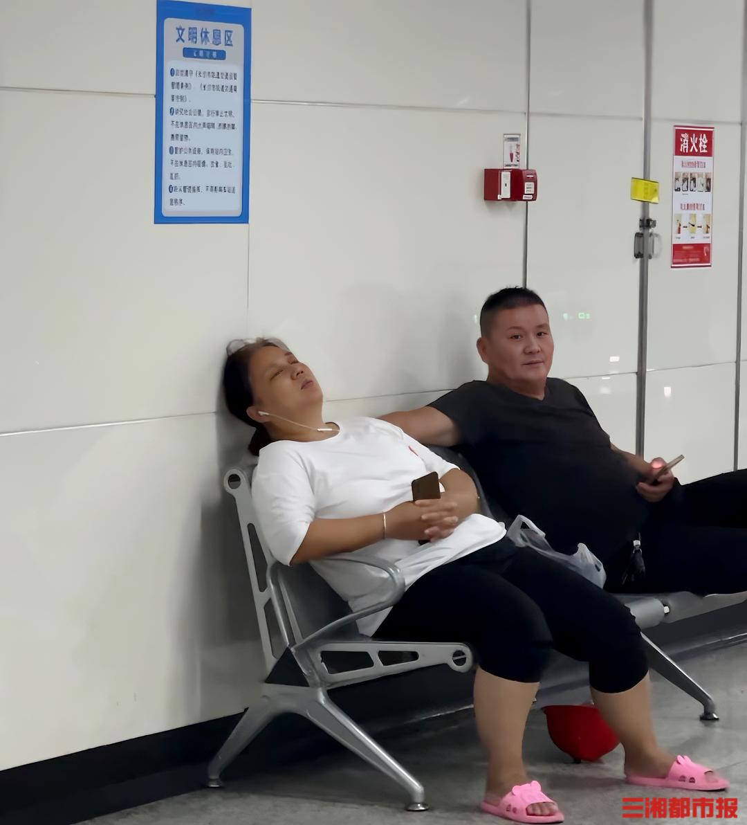 7月16日,长沙文昌阁地铁站,室温26℃左右,市民在文明休息区打盹休憩。王翊玮 摄“我们的文明休息区一般设置在地铁站的进站通道处,市民和游客均可来此避暑纳凉。”长沙地铁1号线文昌阁站值班站长梅晗介绍,“目前长沙地铁全线网除高架站、五一广场站、橘子洲站以外都设置了文明休息区。长沙地铁各站点均配备了充足的防暑药品,以应对乘客中暑等突发情况。”