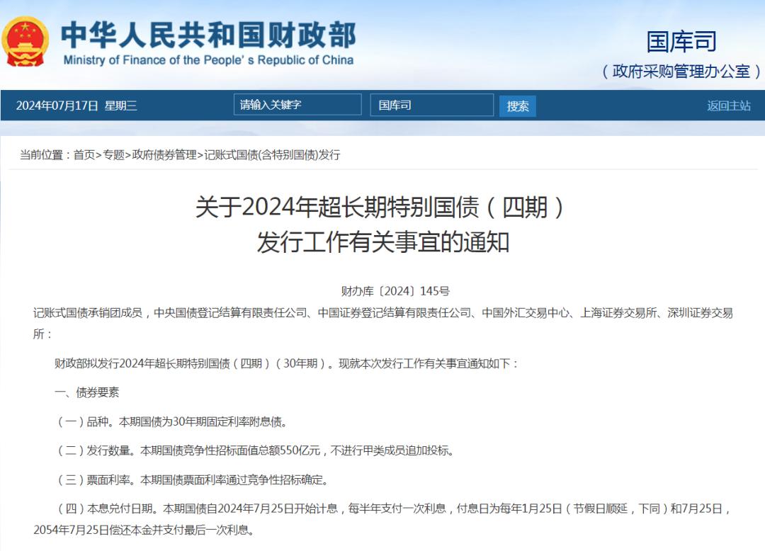 原标题:《7月24日发行!550亿元30年期超长期特别国债》