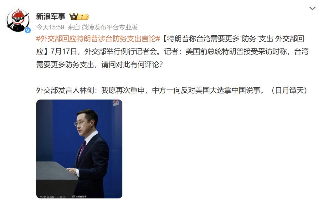 记者:美国前总统特朗普接受采访时称,台湾需要更多防务支出,请问对此有何评论?