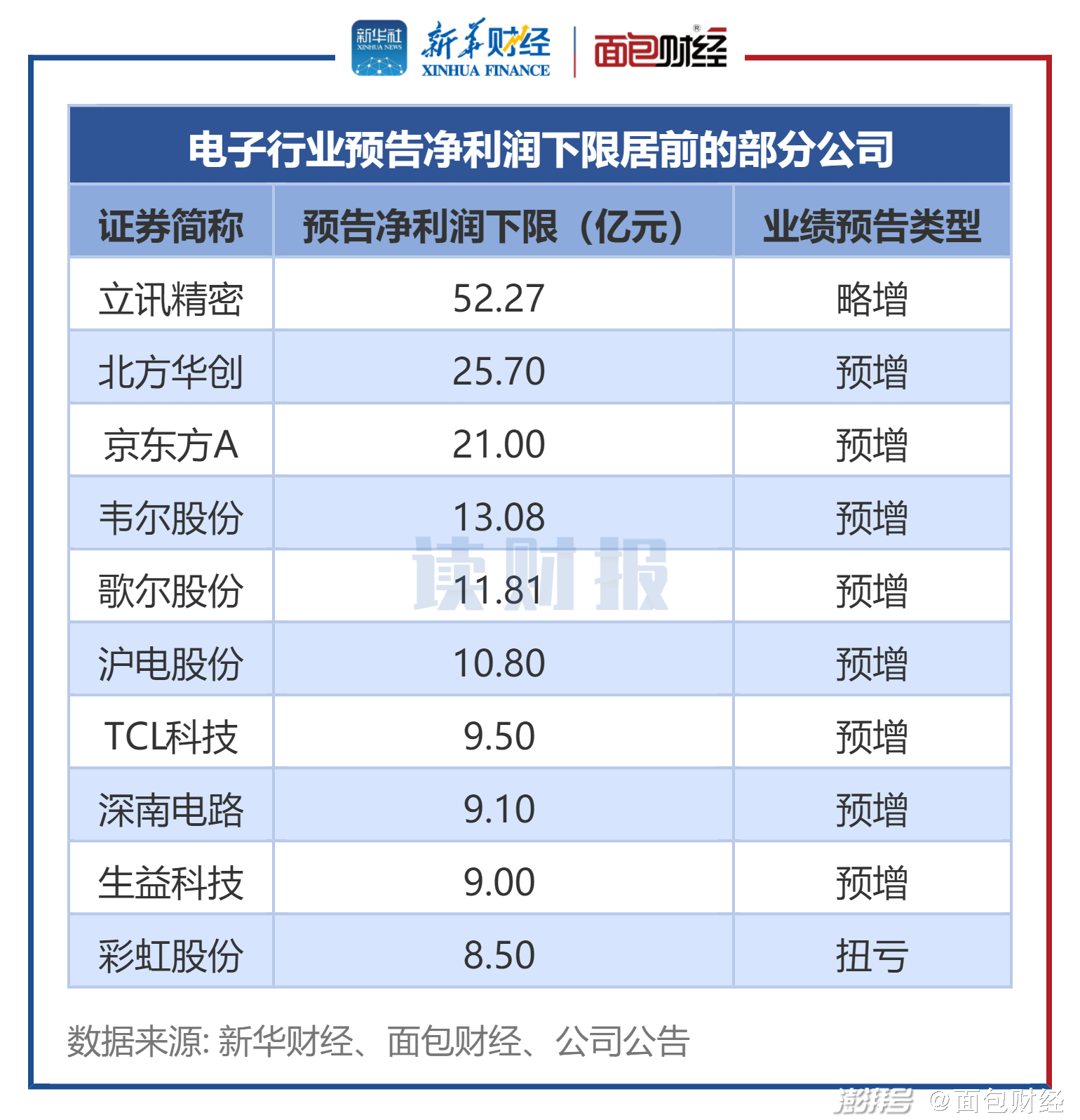 数据显示,立讯精密、北方华创、京东方的预告净利润规模下限位列前三,分别为52.27亿元、25.7亿元和21亿元。