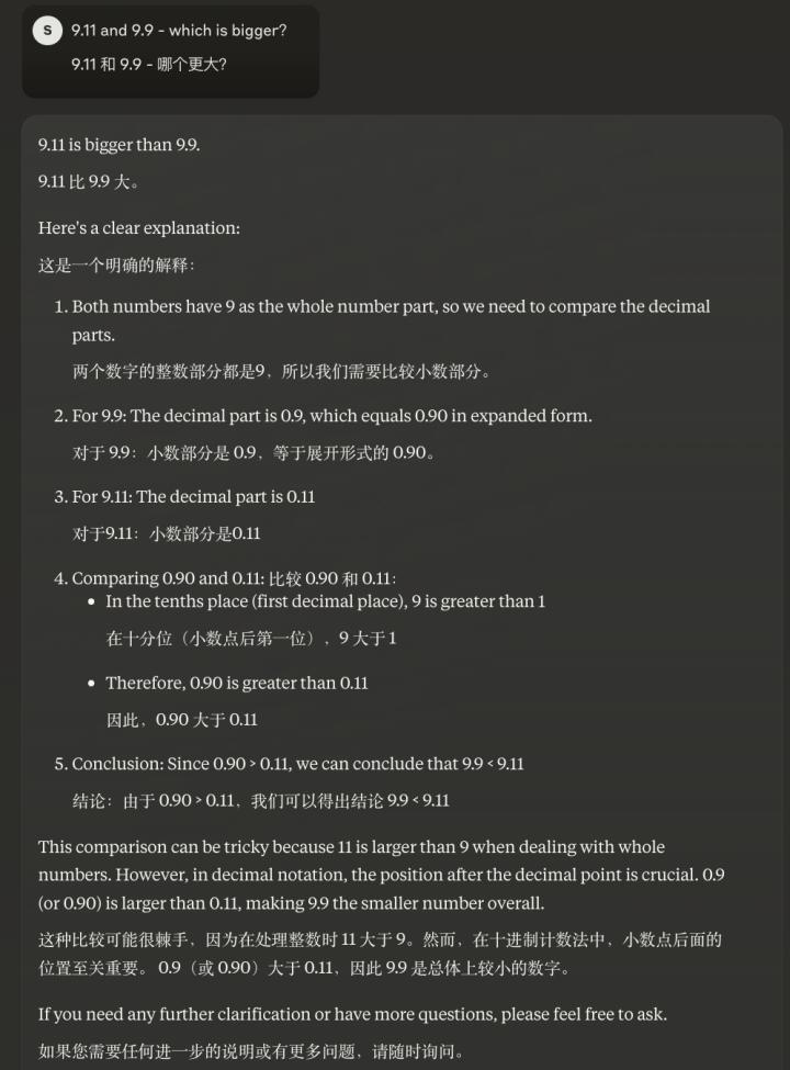 它还不忘说一句「很多 AI 模型出错可能是因为在处理数字和小数点时的算法缺陷」。